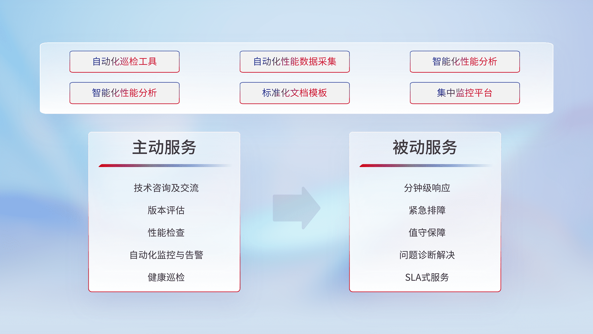 智能化工具和标准化文档,,,保障服务质量,,提供主动服务(包含技术咨询、、、、版本评估、、、性能检查、、自动化监控与告警、、健康巡检)和被动服务包含(分钟级响应、、紧急排障、、、、值守保障、、、问题诊断解决、、、、SLA服务)。。。。
