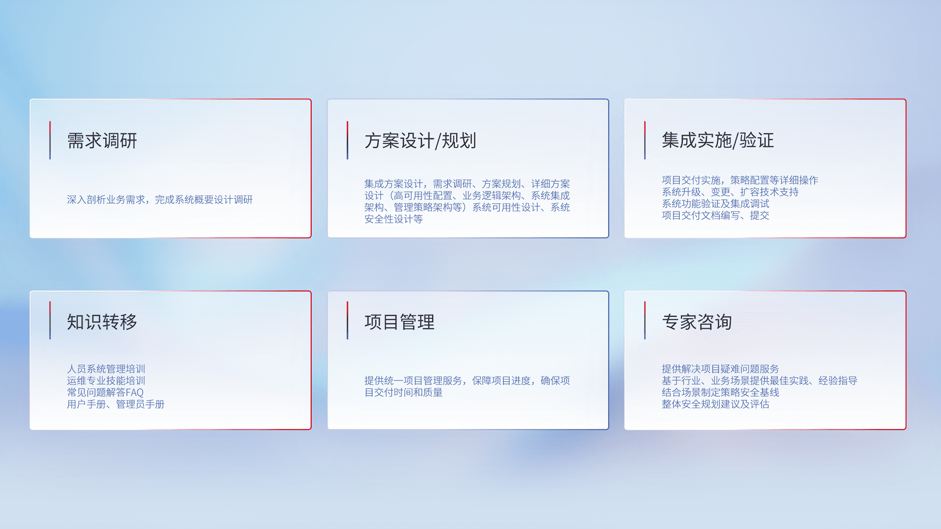 针对客户行业特性,,,将宏观的安全战略和需求,,通过专业的交付服务,,,实现项目落地,,为客户提供标准规范的集成交付服务。。。。